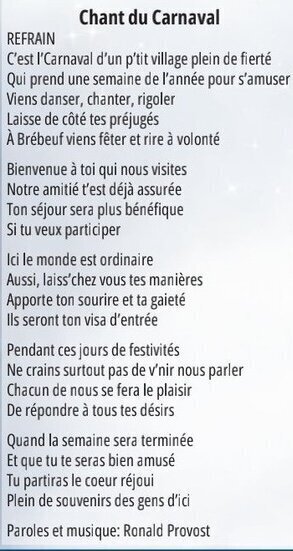 Le Carnaval de Brébeuf tel celui de Québec a son propre chant. Composé en 1975 par Ronald Provost, le fondateur du Carnaval.