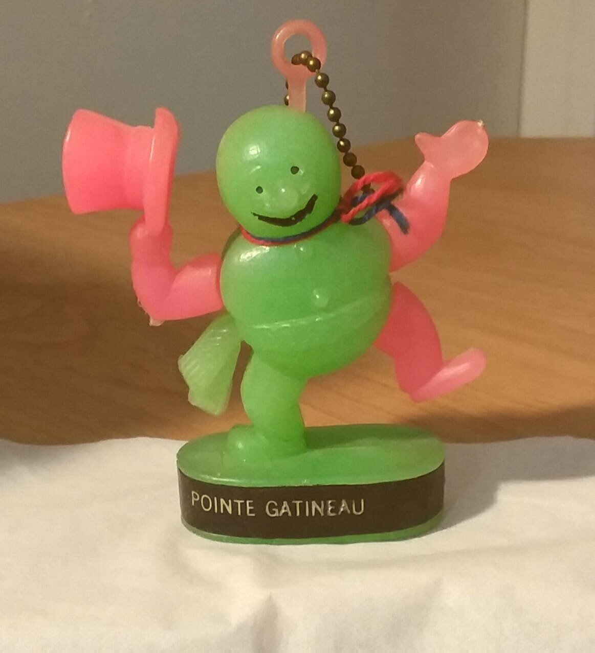 J’ai pu retrouver une figurine du Carnaval de Pointe-Gatineau sur un groupe Facebook de souvenirs de l’Outaouais. On pouvait trouver ces mêmes designs dans plusieurs carnavals qui sont faits à l’usine de Jos Gagnon et Fils de Saint-Jean-Port-Joli, soit les mêmes qui faisaient les figurines du Carnaval de Québec. Cette entreprise, renommée plus tard Plastiques Gagnon, est toujours en activité. En 1992, l’entreprise s’est départie de sa division d’impression. Depuis ce temps, la coopérative Promo Plastik est responsable de la création d’effigies de Québec et de plusieurs autres carnavals.